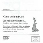 Hey, got a favorite comic or book store that carries your favorite furry titles, or that you wish would carry more? Give us their address! We’ll send them a copy of In-Fur-Nation each quarter, and keep them abreast of the kind of comics and media that you would like to see on their shelves! Remember, they can’t order it if they don’t know it’s out there! As an alternate: Know of any good comic review zines or web sites that might be looking to trade issues?